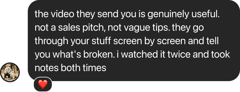 Takes 36 seconds. We'll review your business and send you a personalized video audit within 48 hours. No pitch, no strings.